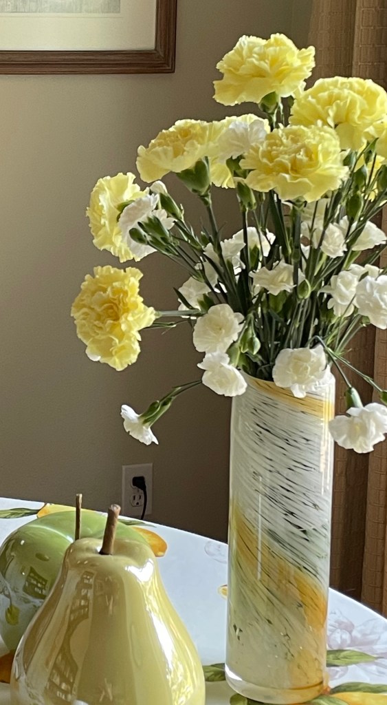 Then I drove to another friendโs home where I will stay this week. On my way, I stopped & bought her a bouquet of yellow & white carnations.